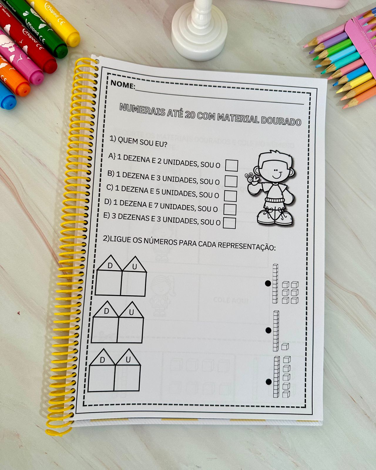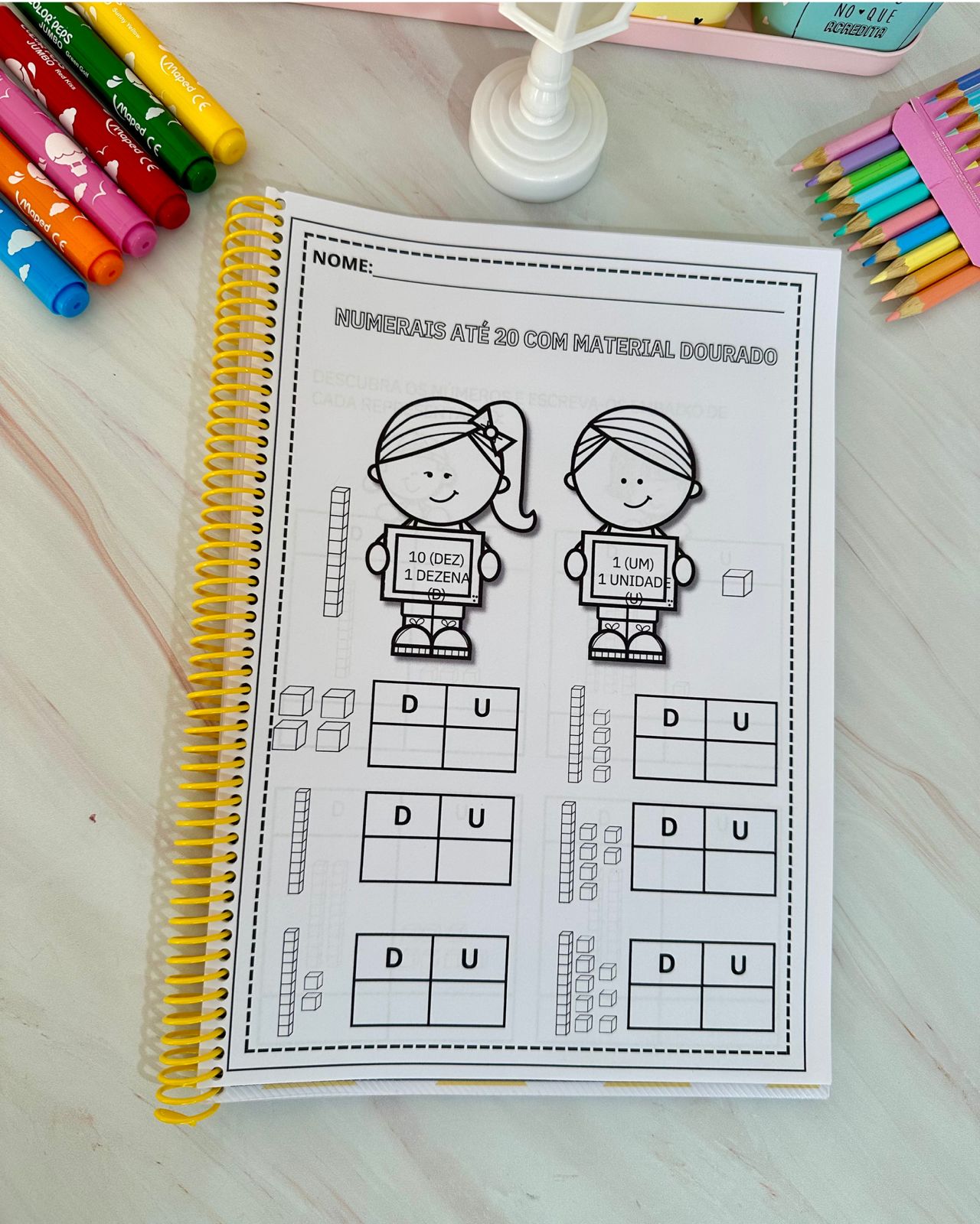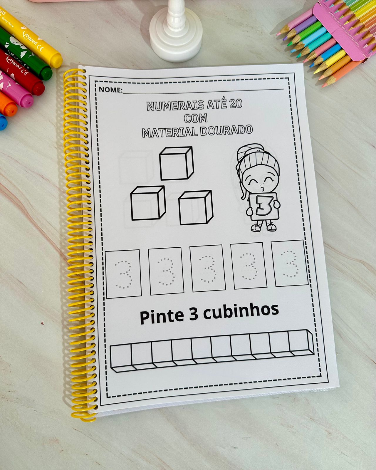 Esta apostila foi desenvolvida para trabalhar os numerais de 1 a 20 de forma lúdica, visual e progressiva, utilizando atividades com material dourado, contagem, traçado e representação de quantidades.