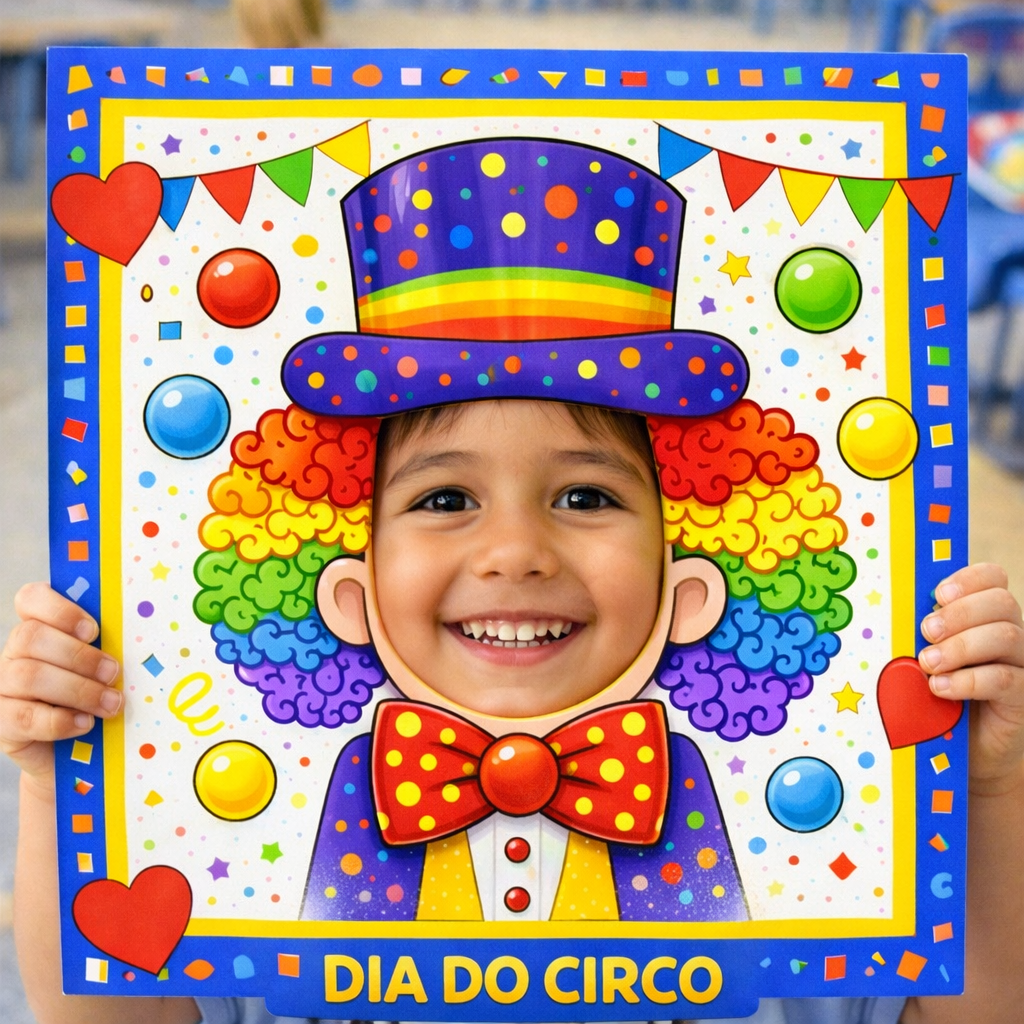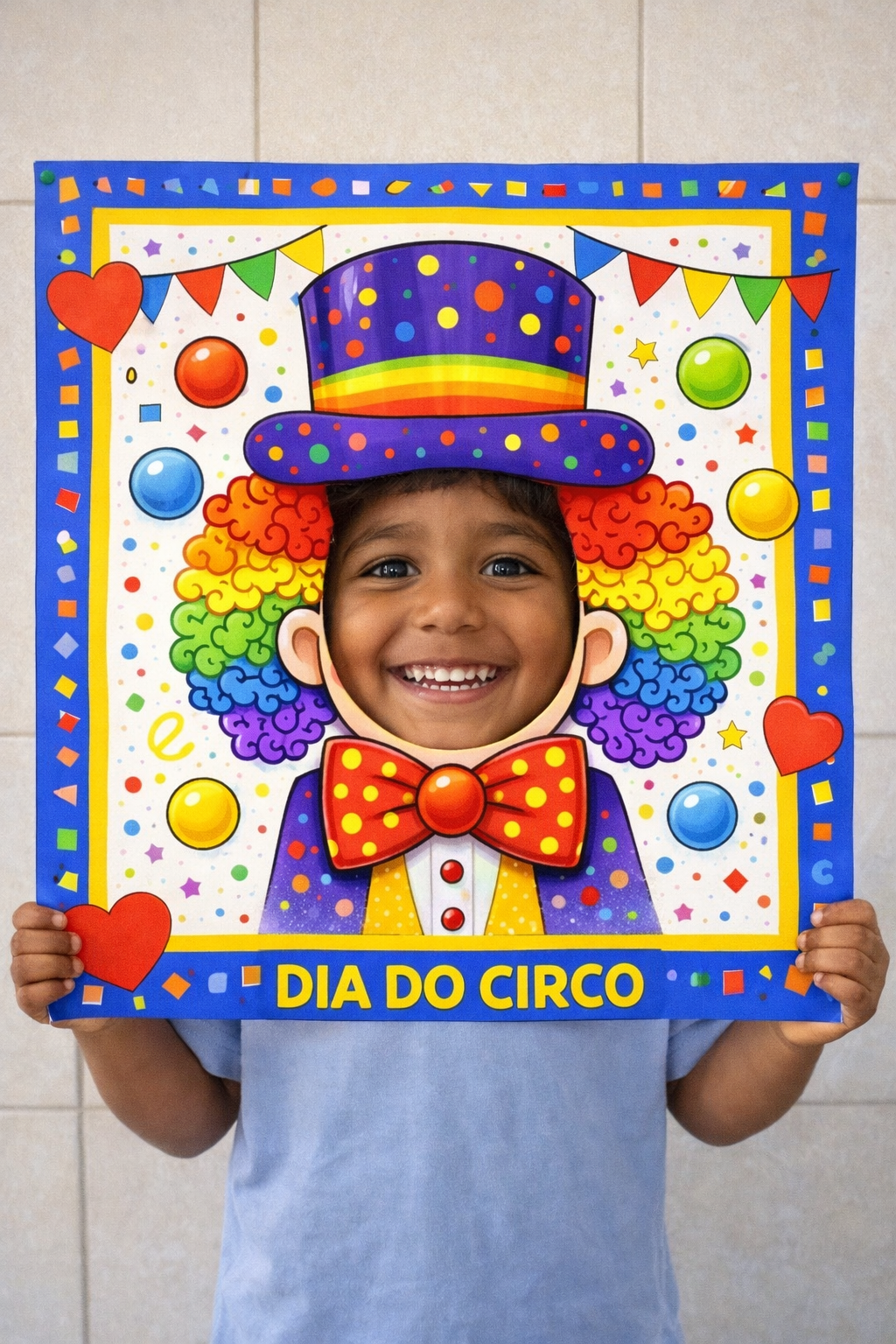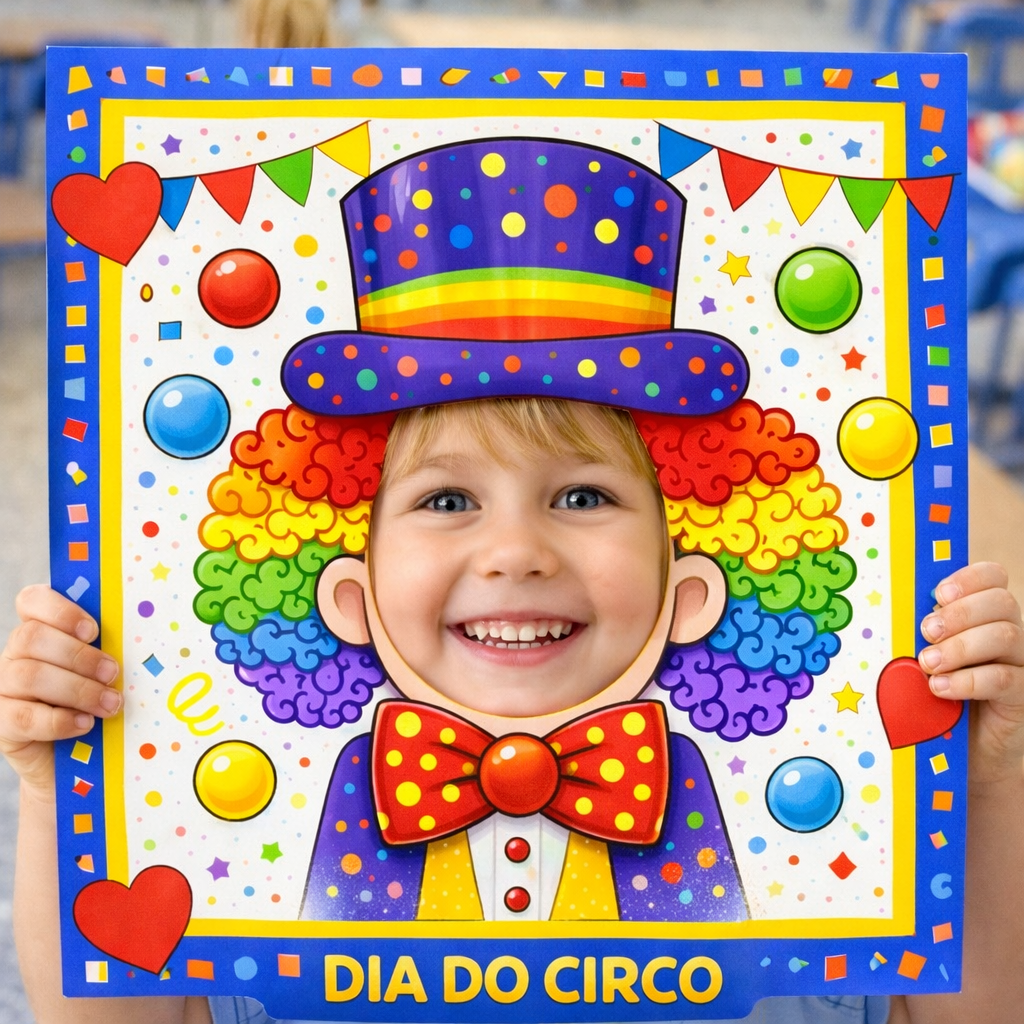 Atividade Dia do Circo para Educação Infantil com painel ampliado e folha A4 para trabalhar com foto do aluno. Material pedagógico em PDF pronto para imprimir, ideal para atividades escolares do Dia do Circo com crianças. Inclui moldura de palhaço e painel para mural em sala de aula.