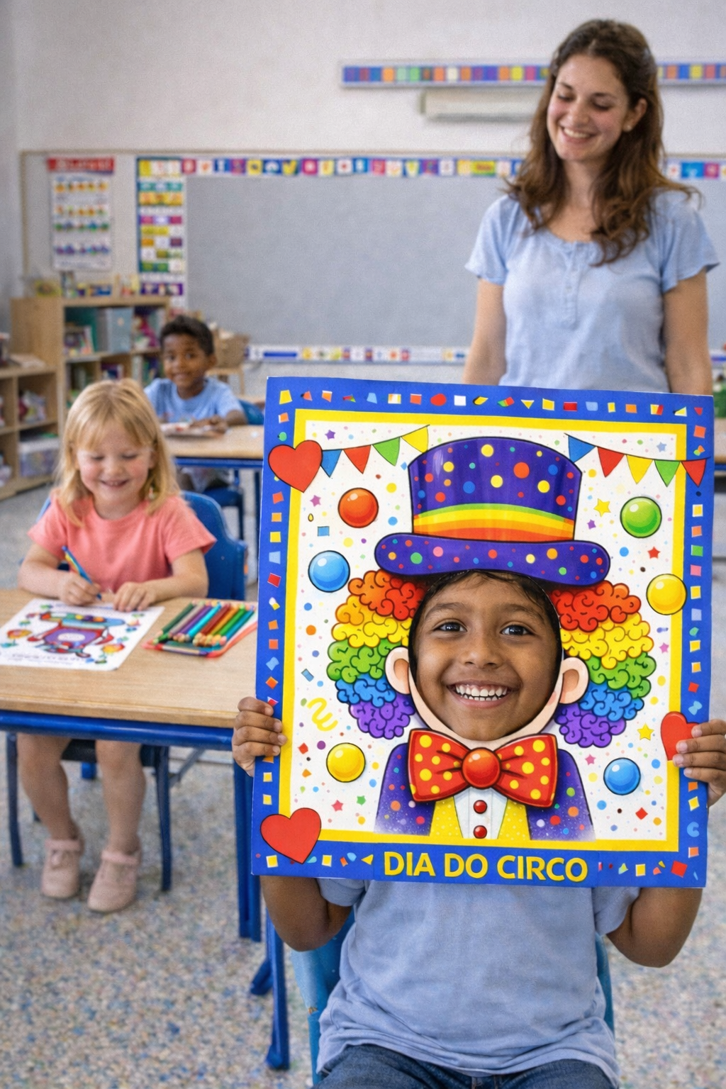 Material pedagógico temático do Dia do Circo desenvolvido para tornar a aula mais divertida, interativa e significativa. A proposta permite trabalhar identidade, criatividade e participação dos alunos por meio de atividades com foto e produção artística.