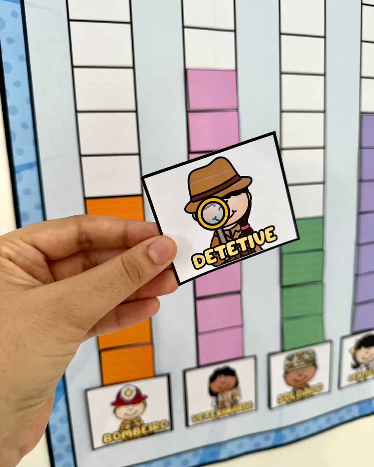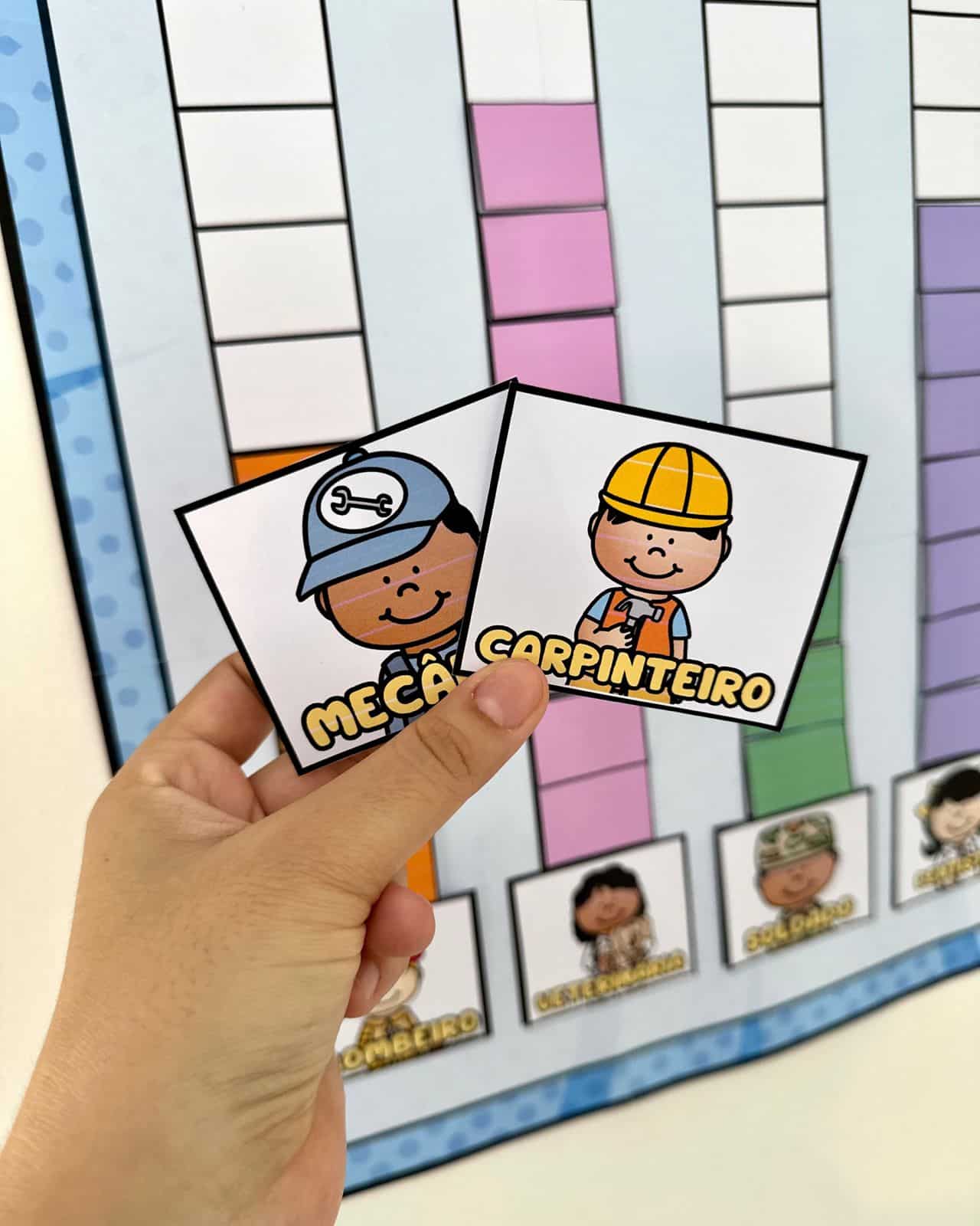 Por meio de uma dinâmica de votação, as crianças escolhem suas profissões favoritas e participam ativamente da atividade, desenvolvendo habilidades sociais, comunicação e ampliação do repertório cultural sobre o universo profissional.