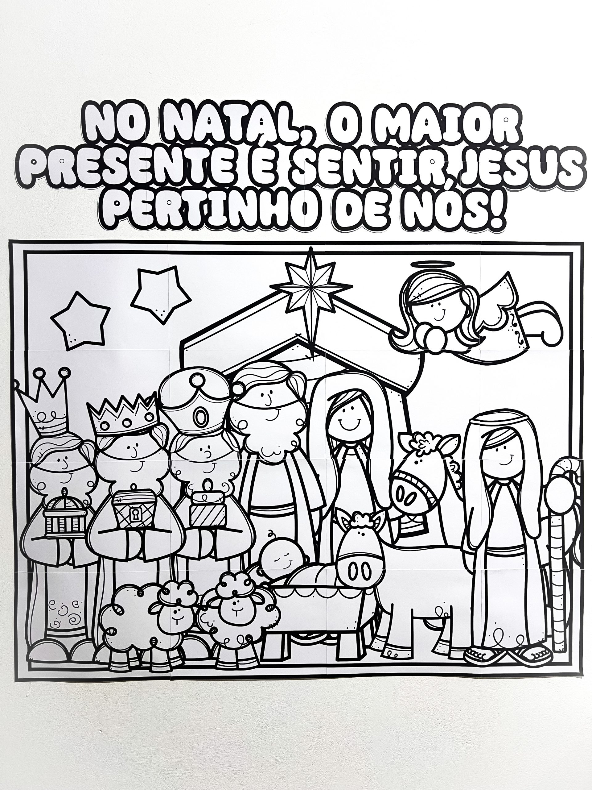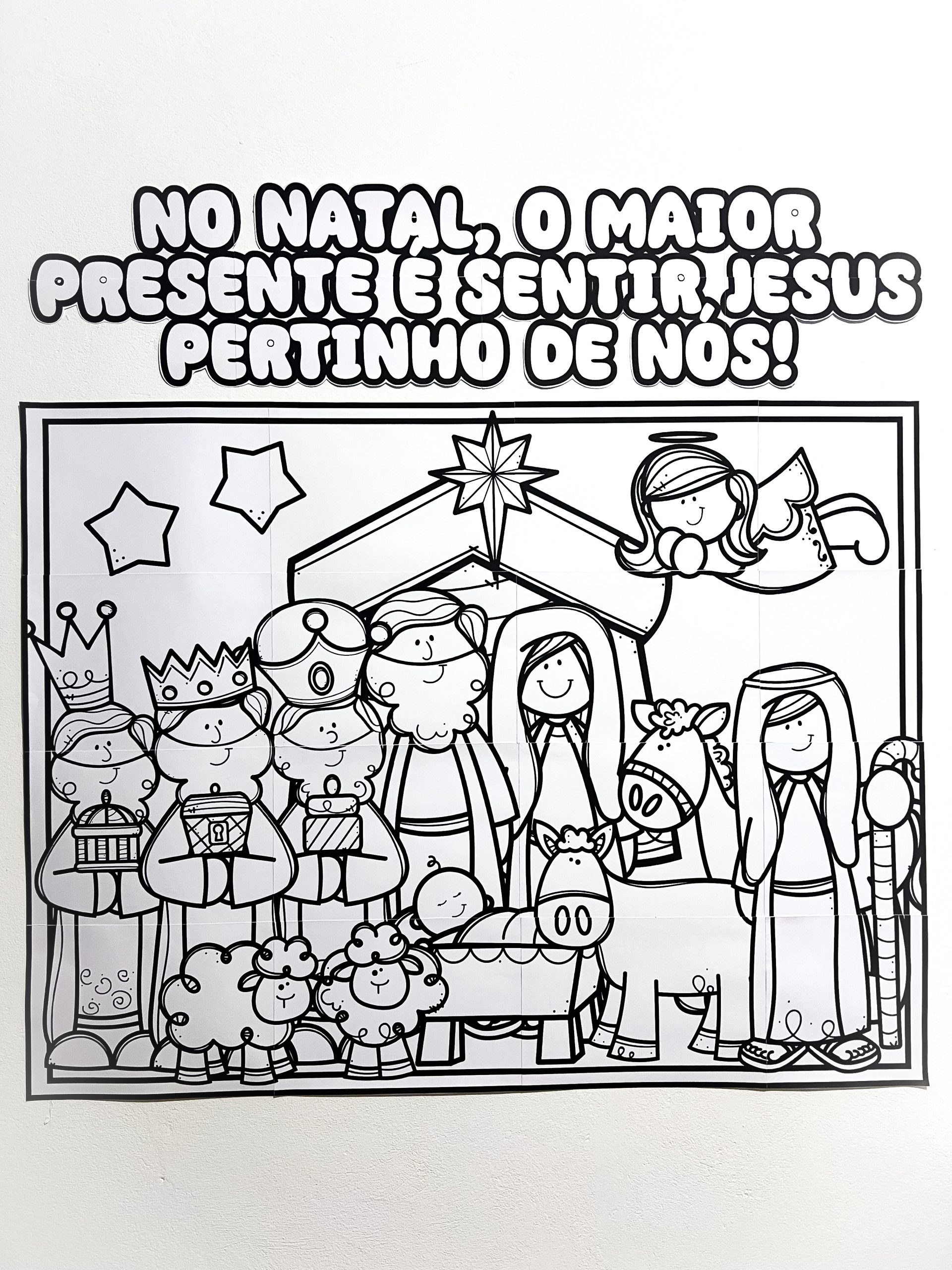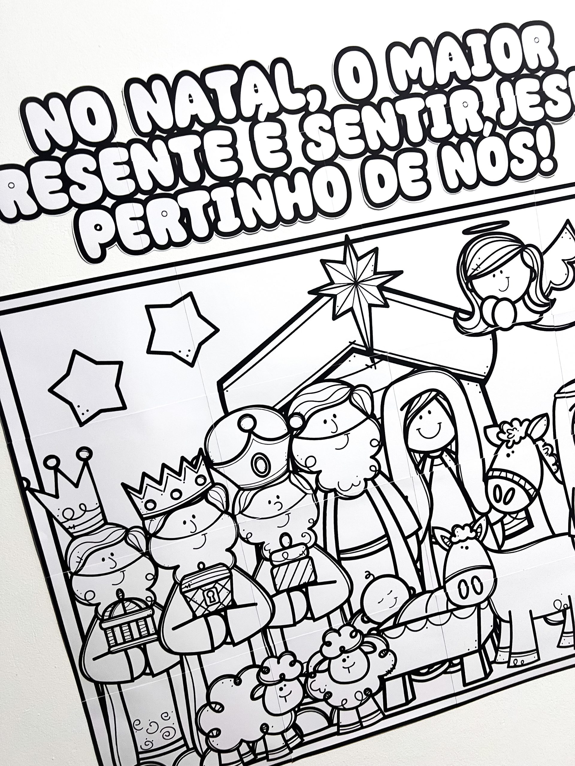 A proposta é totalmente colaborativa: cada aluno colore sua parte individualmente ou em duplas, contribuindo para a montagem final de um lindo painel cristão de Natal, cheio de significado, espiritualidade e participação ativa.
