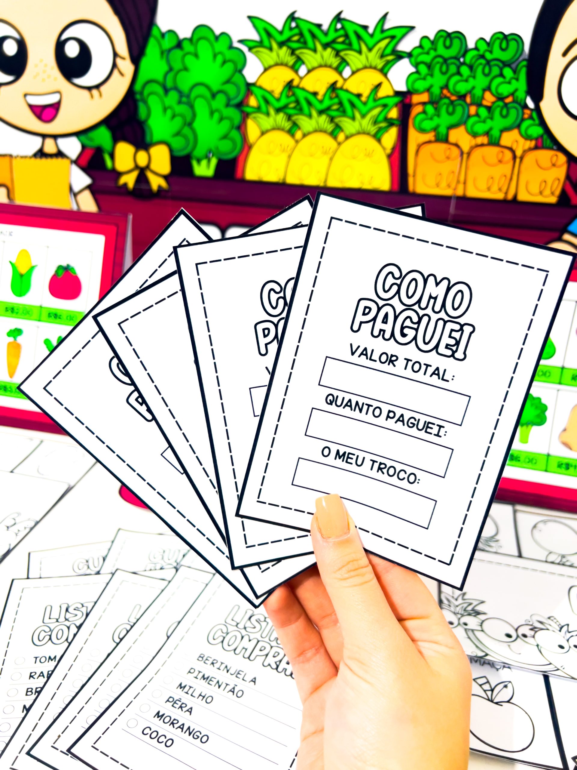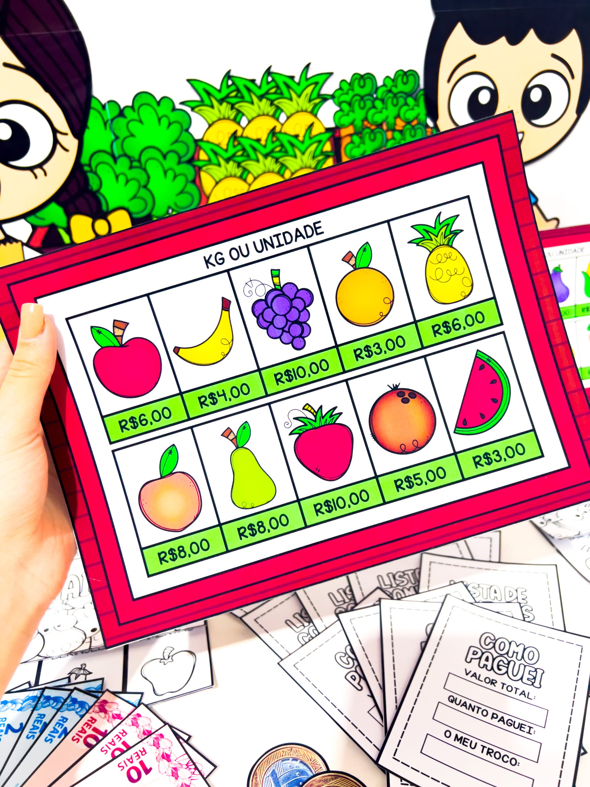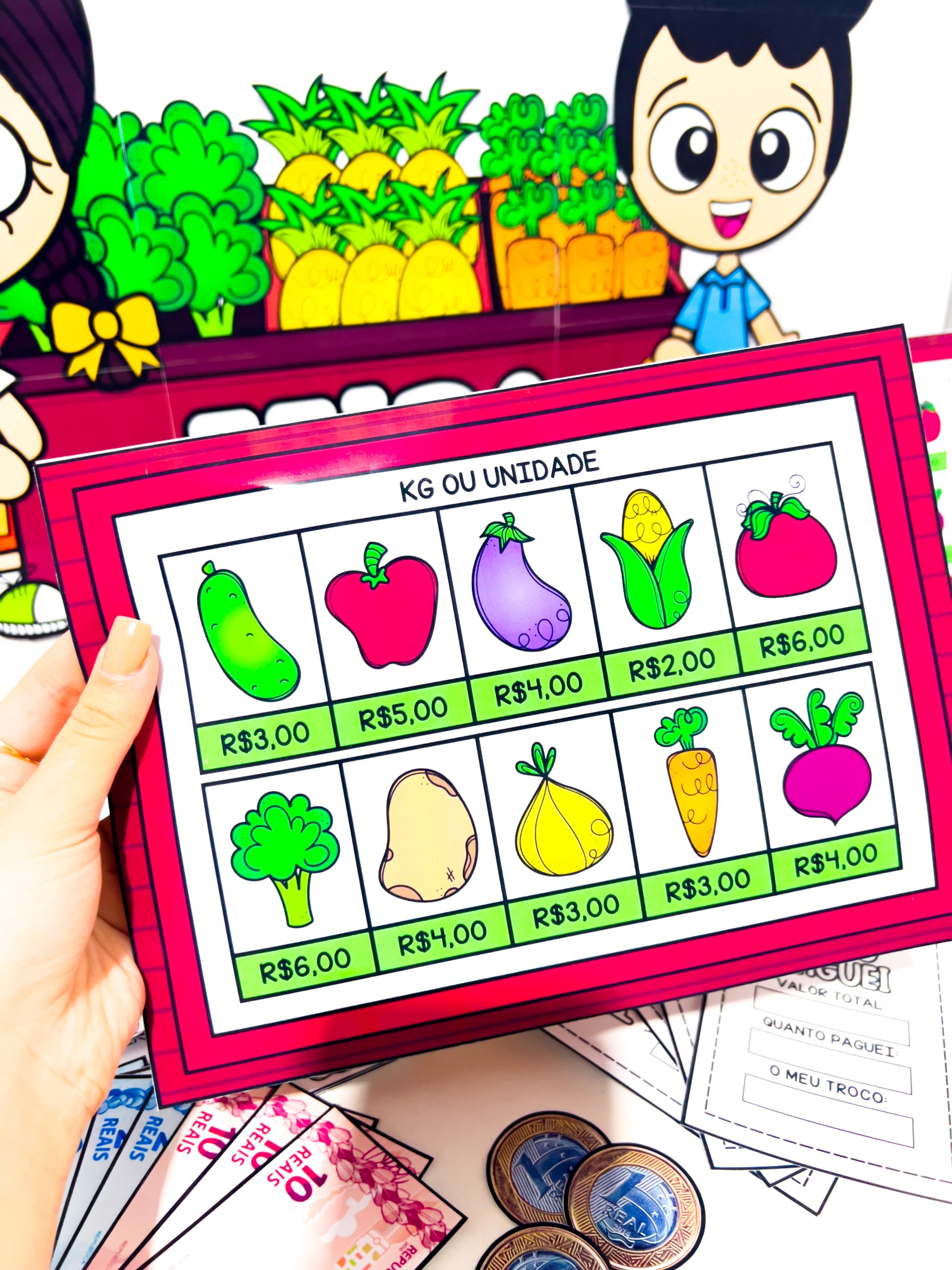 O Comprando na Feira para Imprimir – Jogo Pedagógico com Dinheiro e Matemática é um material pedagógico lúdico e completo criado para proporcionar às crianças uma experiência realista de compras, trabalhando de forma prática conteúdos de matemática, leitura, escrita, noções de valor e convivência social.