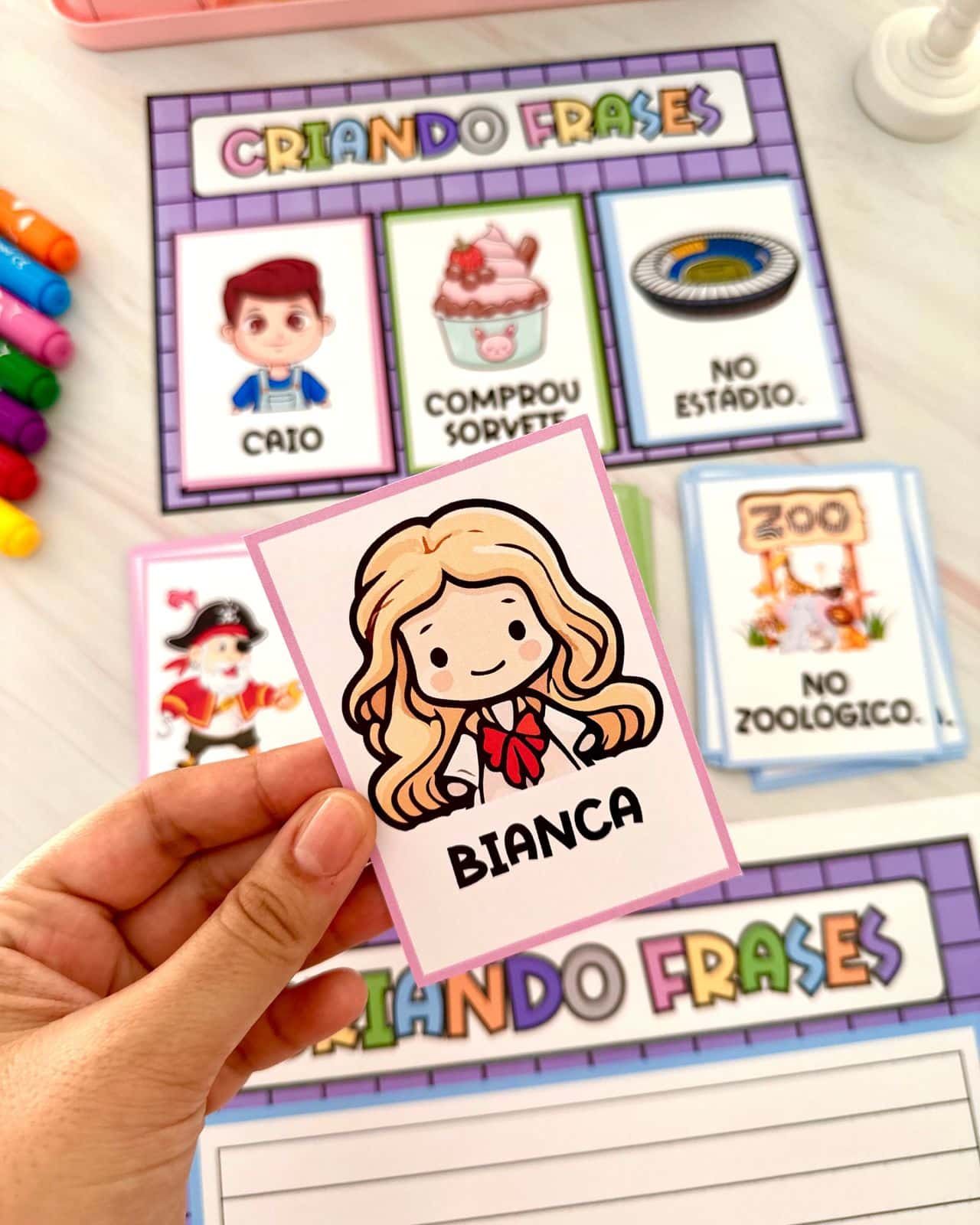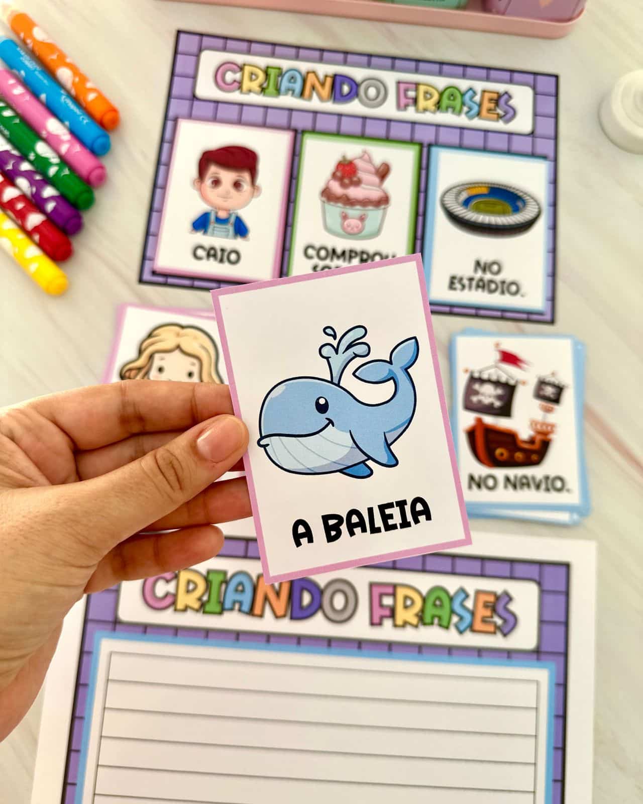Material Criando Frases 📘Este material é ideal para trabalhar com crianças da Educação Infantil e das séries iniciais do Ensino Fundamental. Ele é excelente para estimular a fala e a compreensão da estruturação de frases, podendo ser utilizado mesmo com crianças que ainda não sabem ler ou escrever, graças às fichas ilustradas e de fácil compreensão.