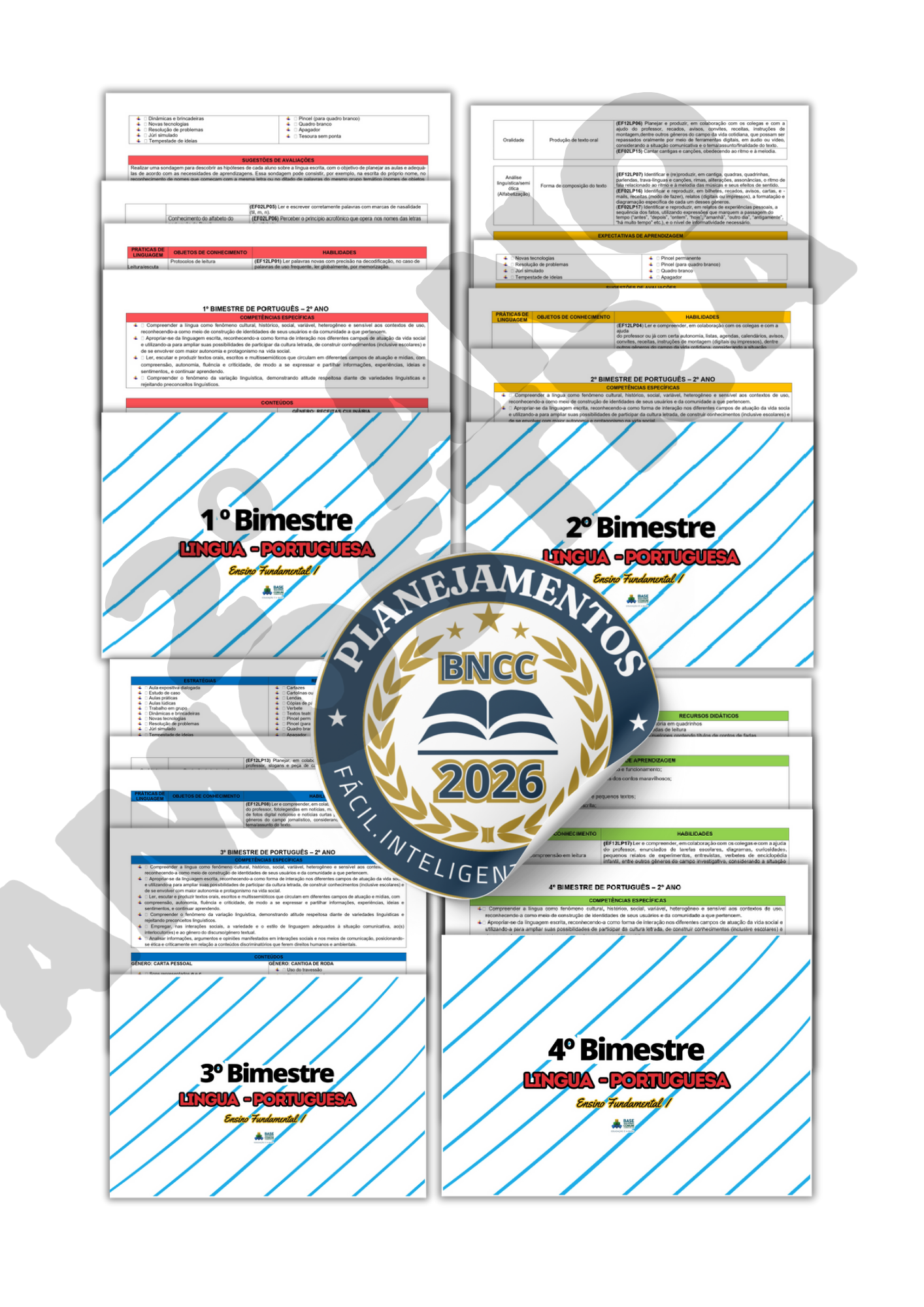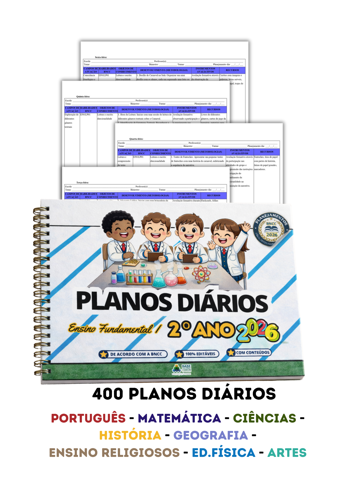 O Kit Completo de Planejamento 2º Ano 2026 foi desenvolvido para professores que desejam organização pedagógica, economia de tempo e segurança no cumprimento da BNCC. Um material estruturado para atender todas as disciplinas do 2º Ano, com documentos editáveis e prontos para aplicação.