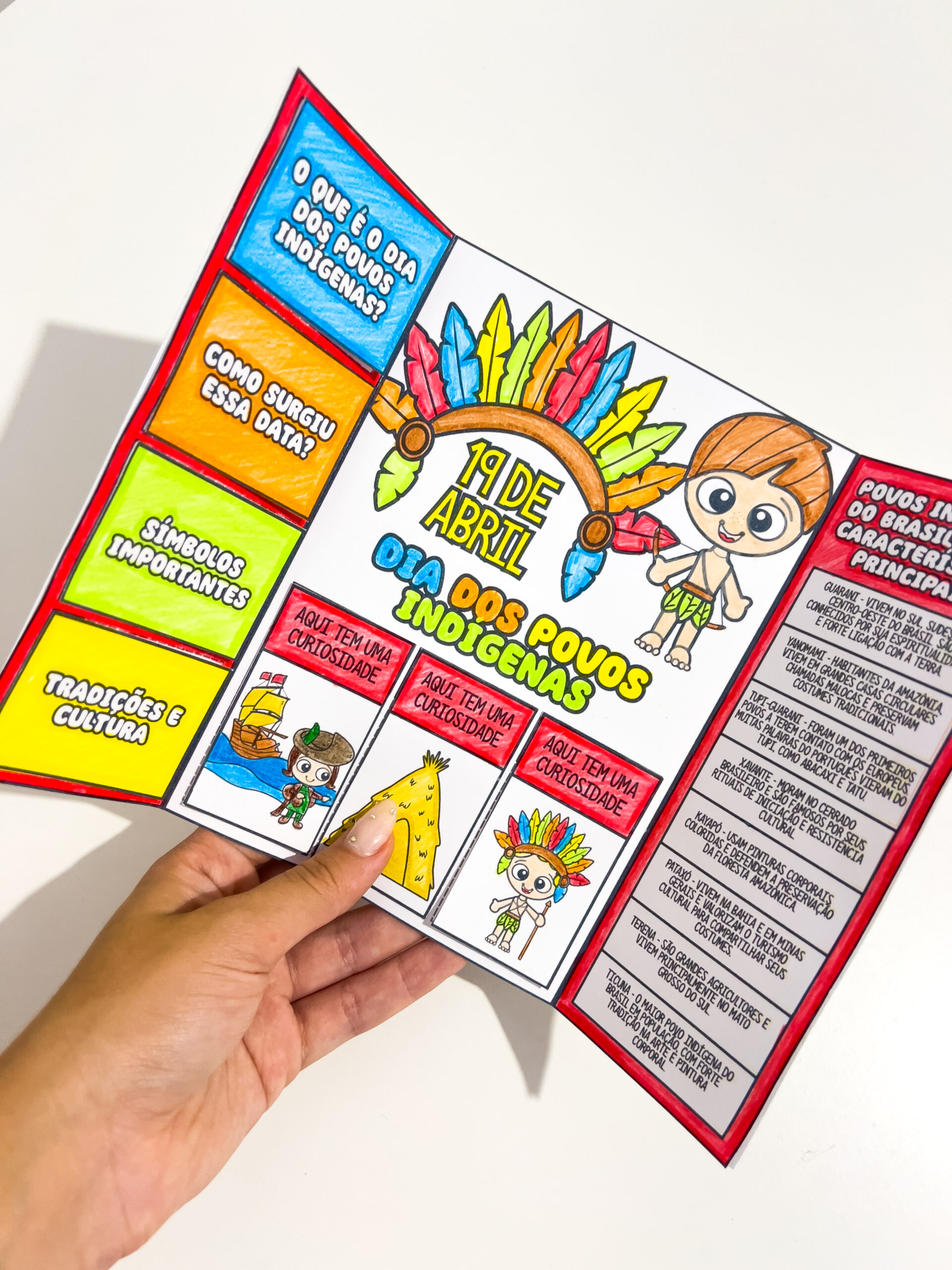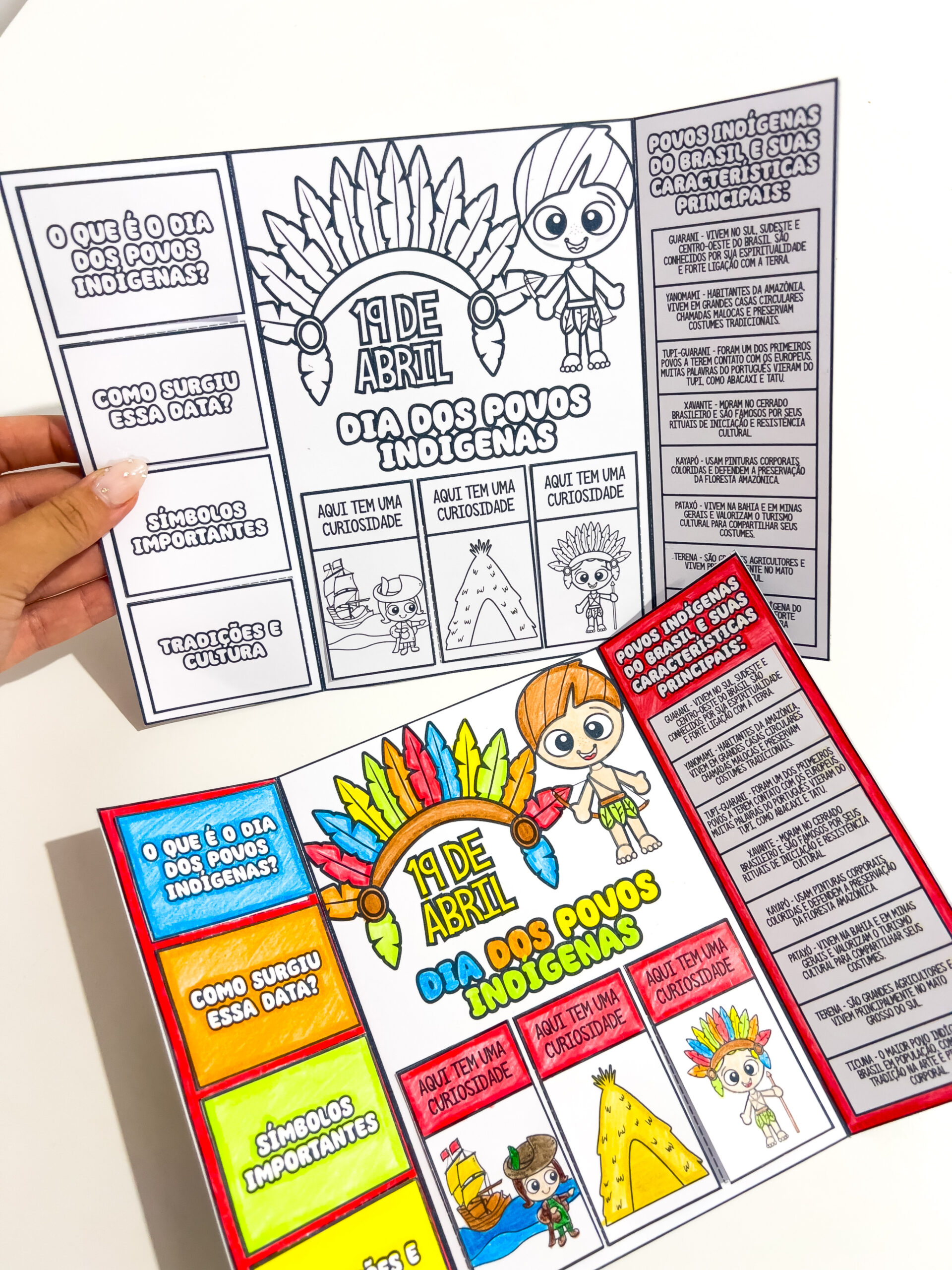 O aluno monta o lapbook utilizando recorte e colagem, explorando informações sobre os povos indígenas.