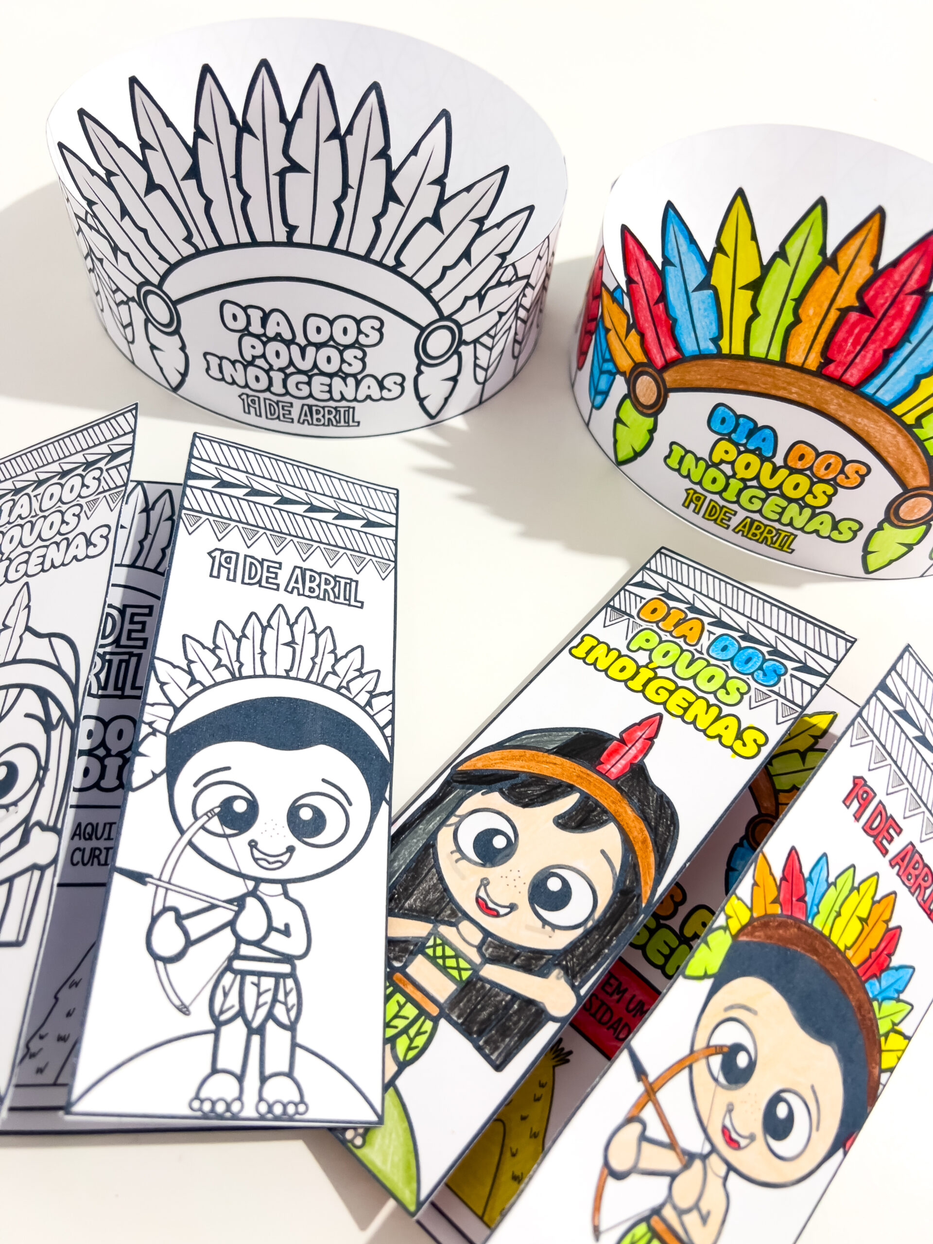 Material pedagógico com lapbook do Dia dos Povos Indígenas para Educação Infantil, acompanhado de coroa temática para colorir.