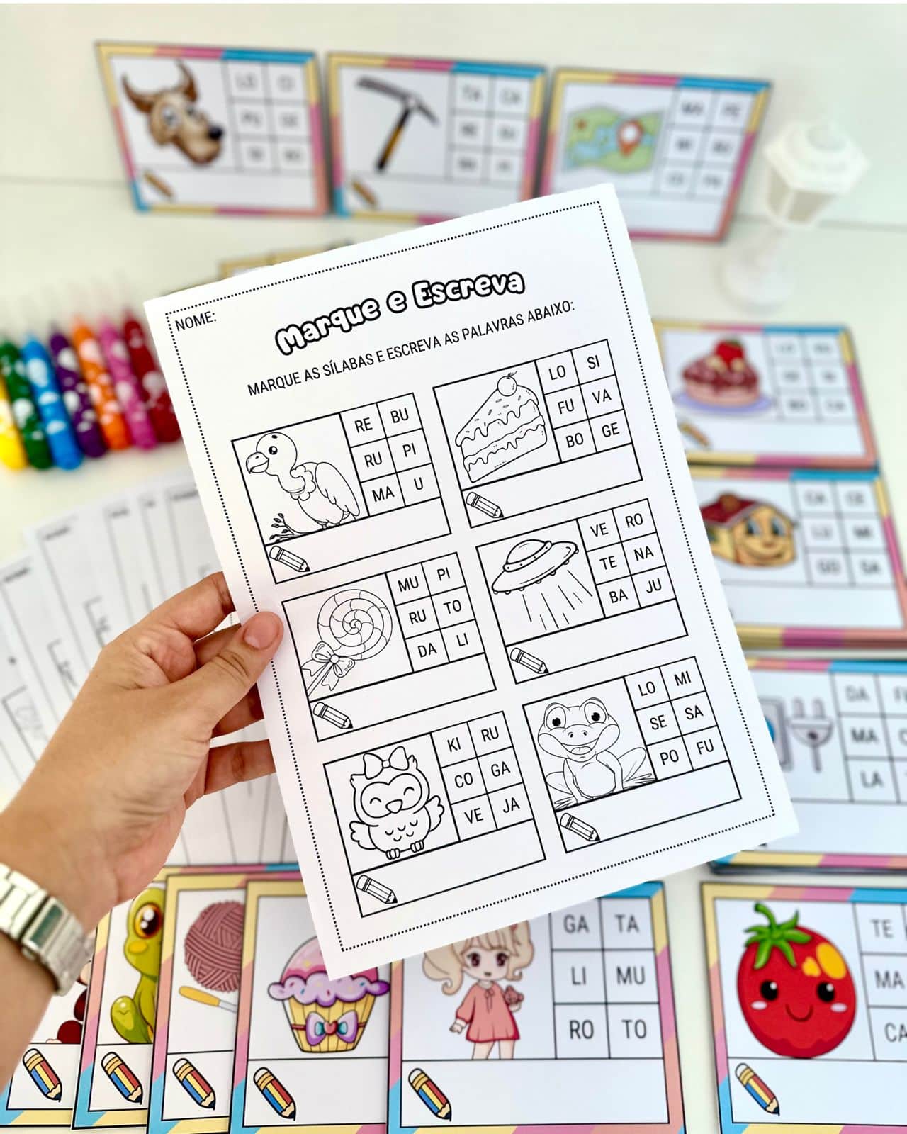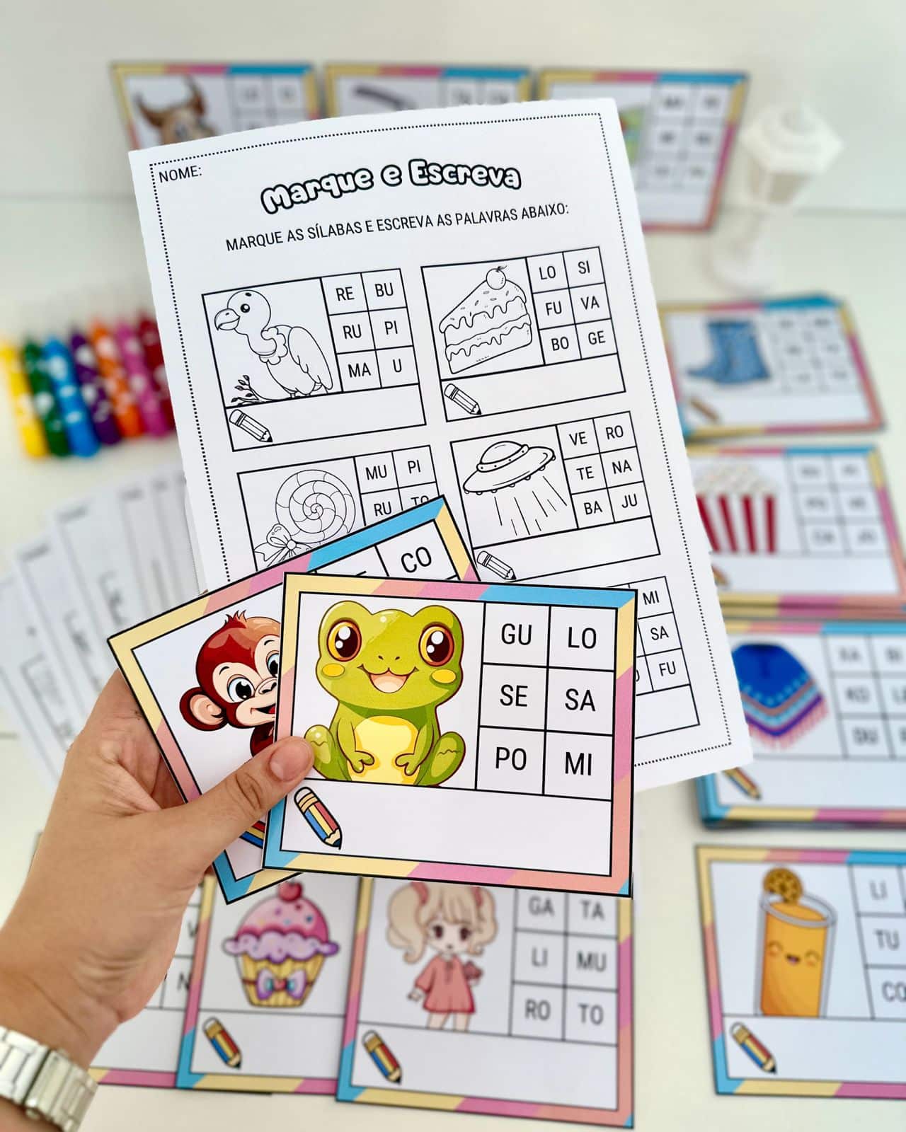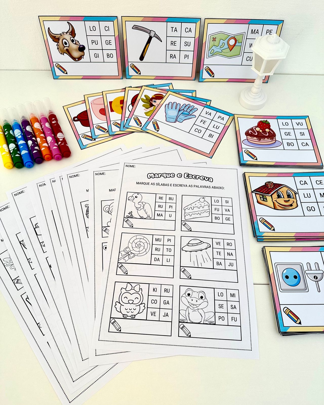 Kit de materiais “Marque e Escreva” para trabalhar leitura de sílabas e escrita de palavras de sílaba simples com crianças em fase de Alfabetização. O arquivo vai em PDF pronto para impressão, e inclui 10 folhas de atividades e 60 fichas de palavras de sílabas simples.👍✍️ Material excelente para estimular o desenvolvimento do conceito de escrita e de leitura, além de favorecer o aumento do vocabulário.🔄🖍️ Para utilizar as fichas várias vezes é recomendado aplicar o papel contact no material e utilizar com caneta para quadro branco.🎉🤝