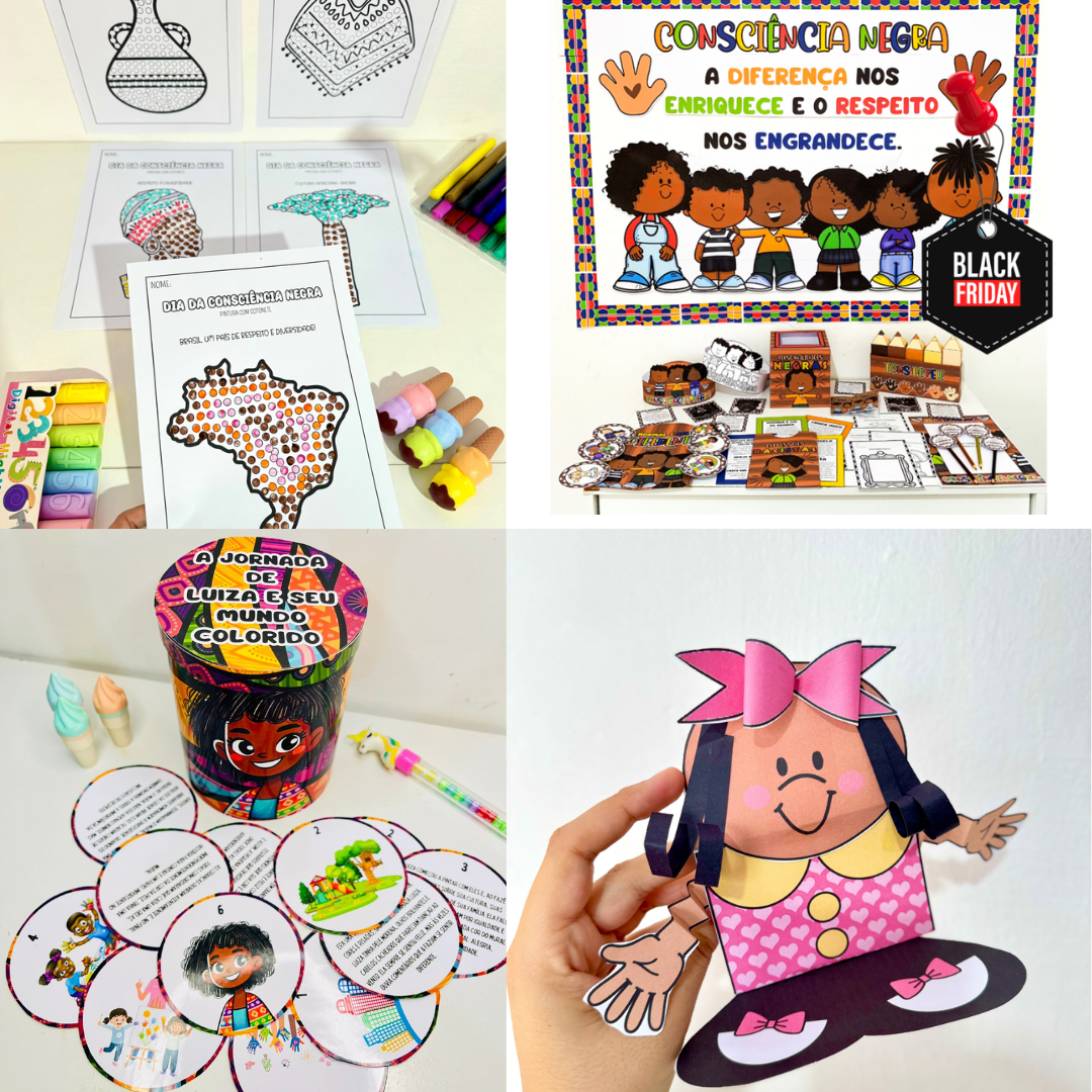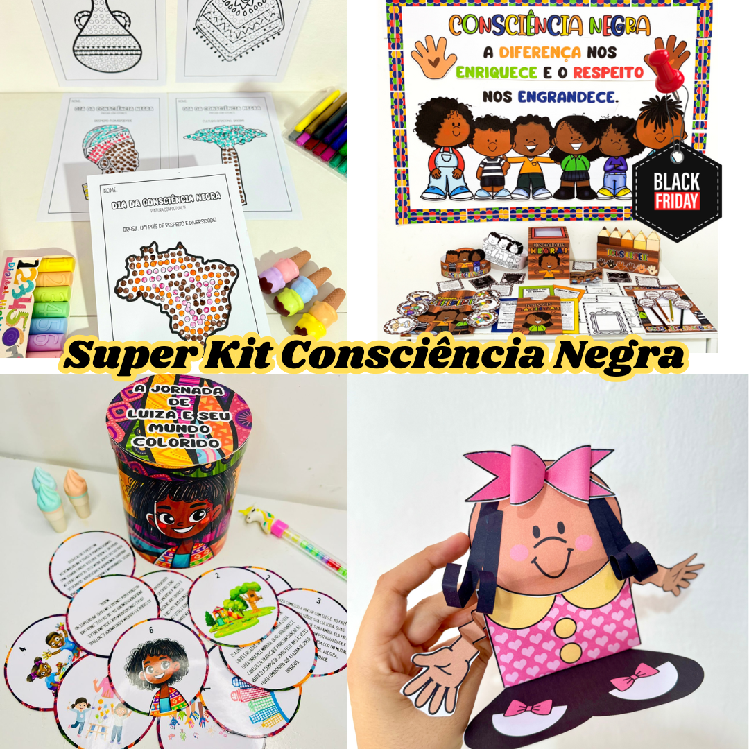 O Super Kit Consciência Negra reúne 8 materiais incríveis para trabalhar o tema de forma lúdica, artística e significativa com crianças da Educação Infantil e dos Anos Iniciais.