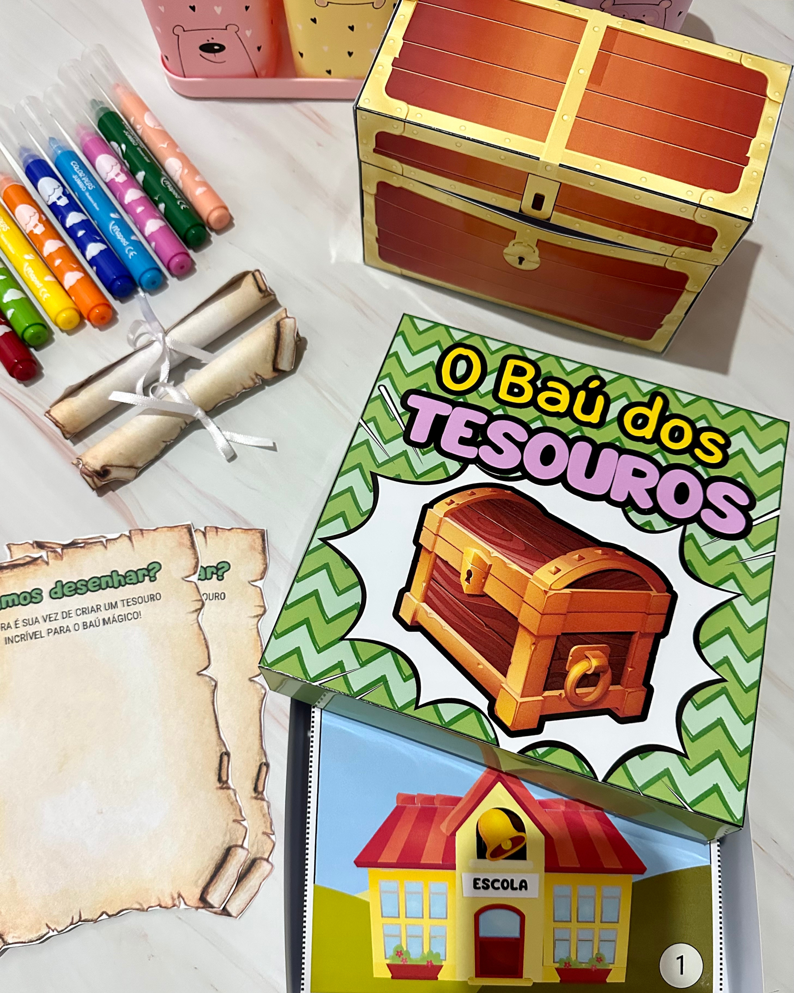 - Estímulo à Imaginação e Criatividade: A história do “Baú dos Tesouros” e a atividade de desenho oferecem um espaço seguro para que as crianças explorem sua imaginação e expressem sua criatividade de maneira livre e espontânea.