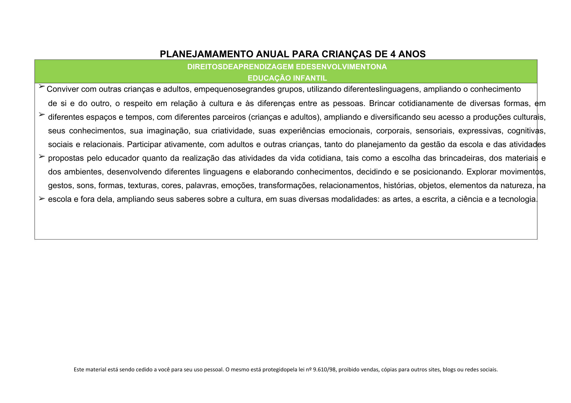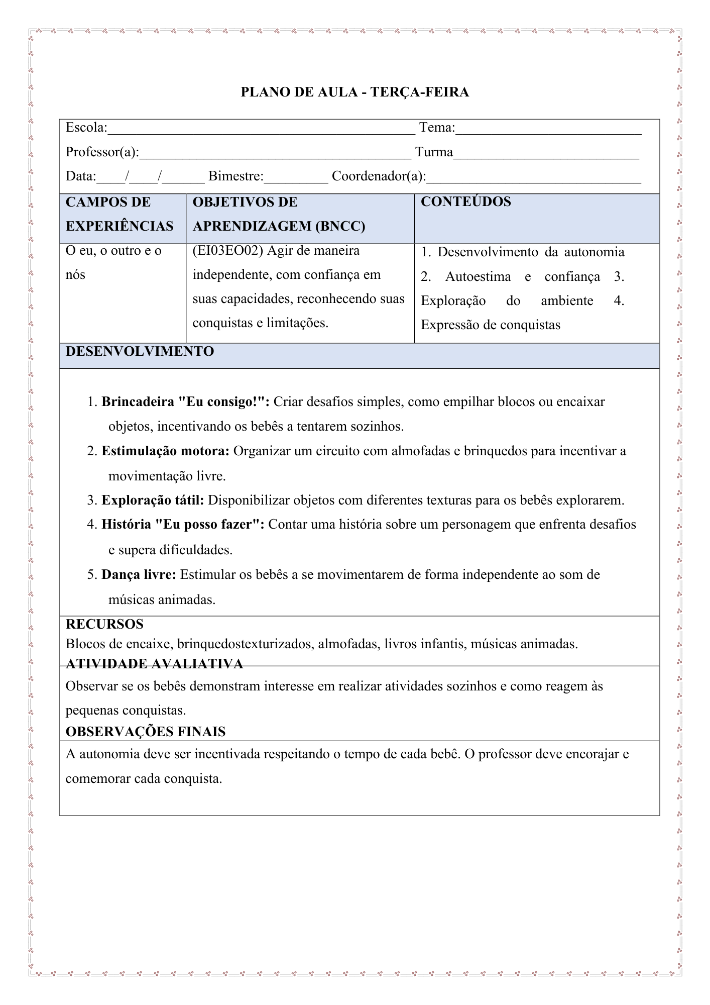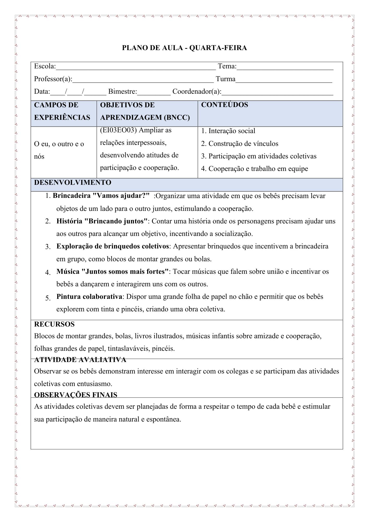 Este material reúne planejamento anual, mensal e diário, organizado do 1º ao 4º bimestre, com planos de aula estruturados para todo o ano letivo, respeitando as especificidades da infância, o brincar, as interações e as experiências significativas.