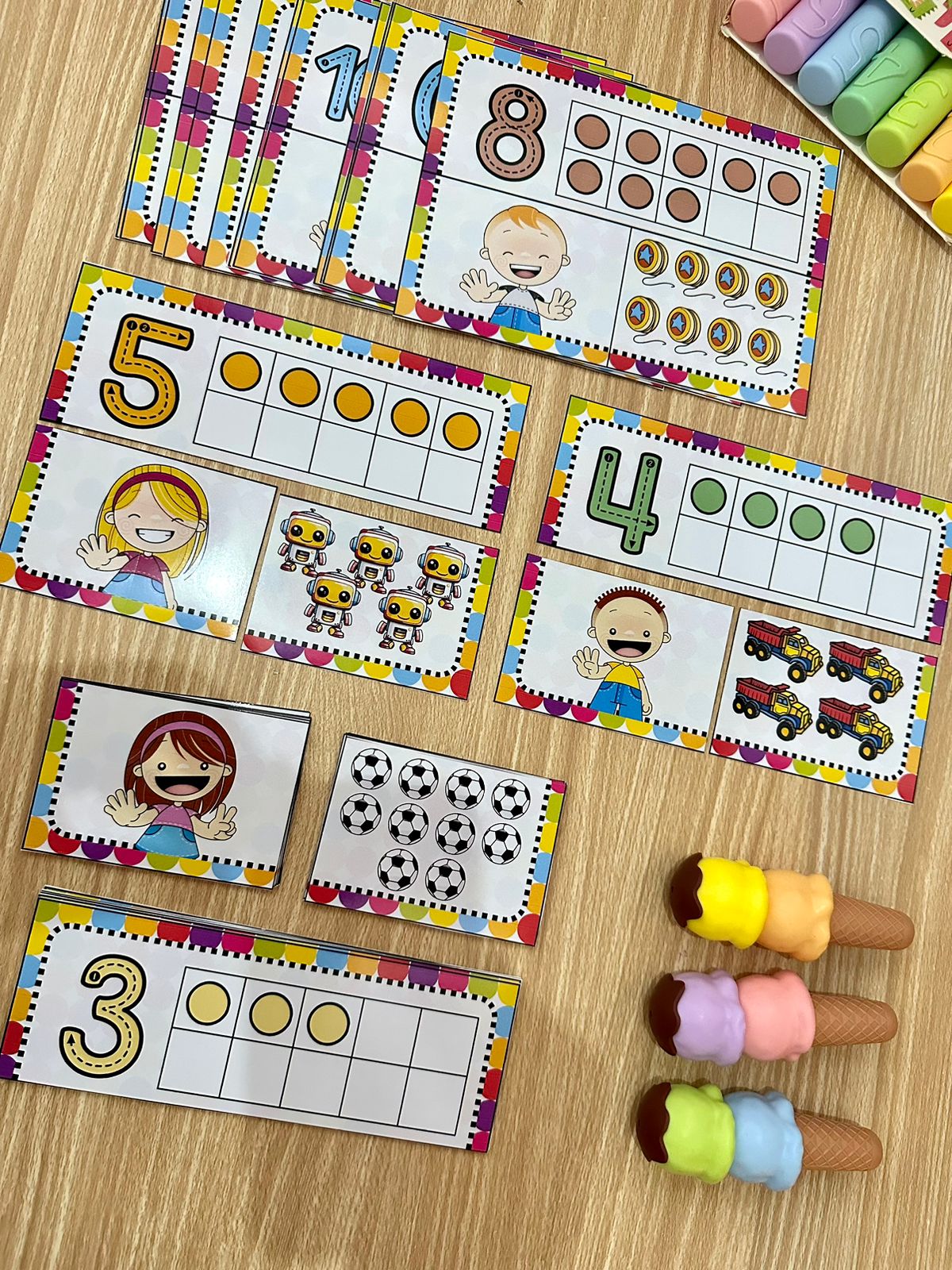 - Relacionamento Numérico-Quantitativo: Cada numeral é acompanhado por uma representação visual da quantidade correspondente, permitindo que a criança desenvolva a habilidade de associar números a quantidades de forma concreta e tangível.